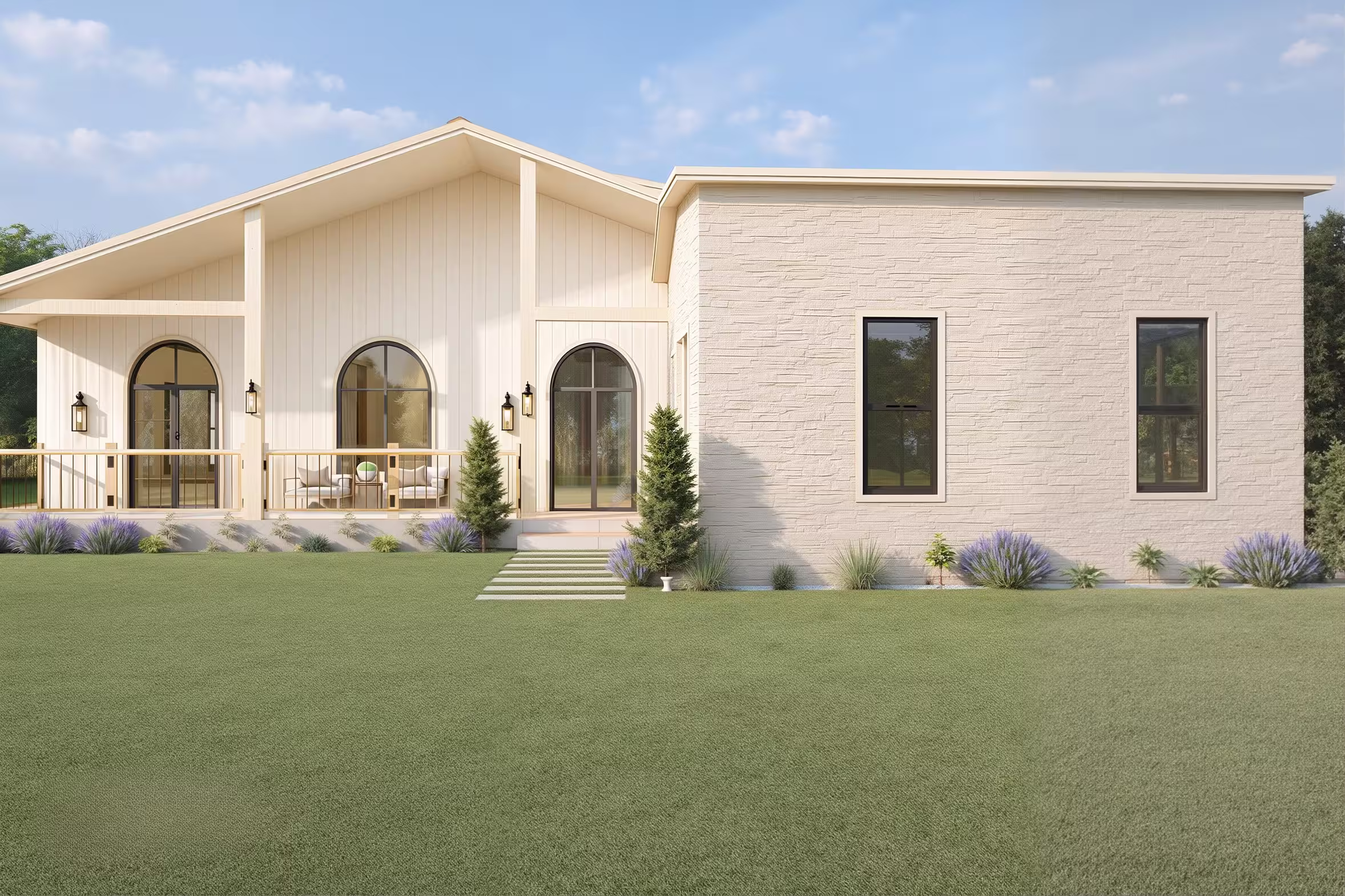Clean modern façade with stone accents